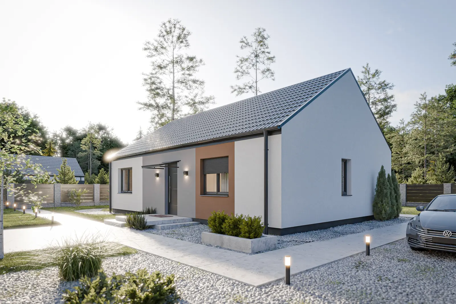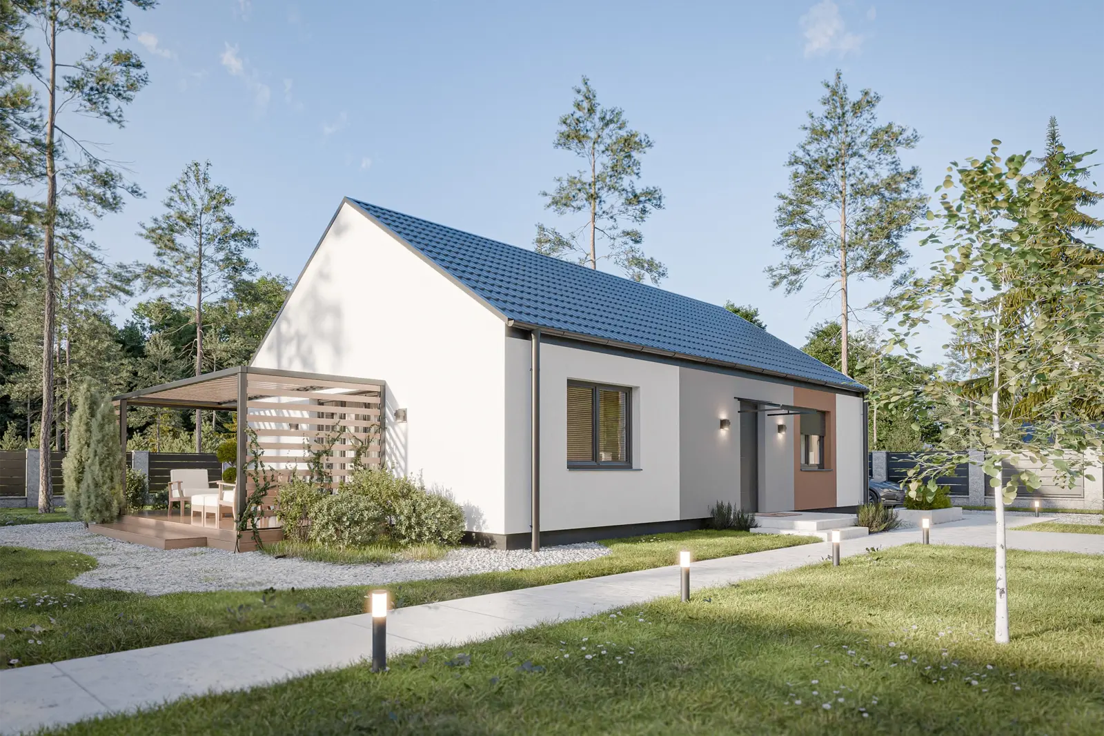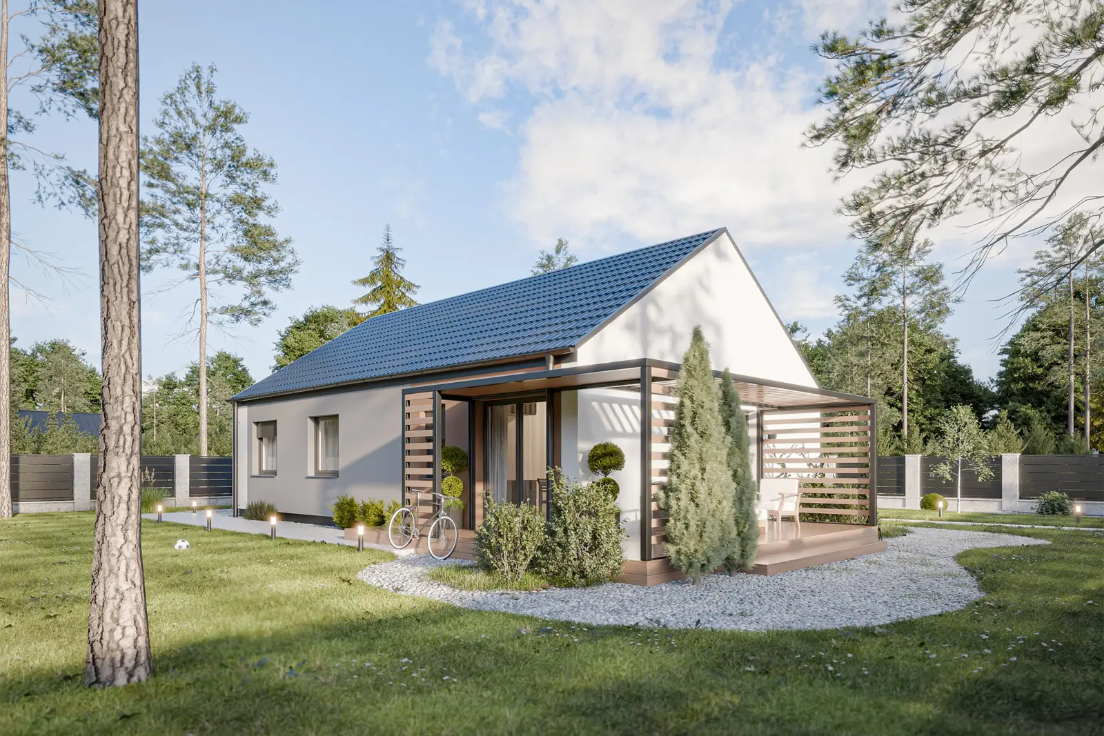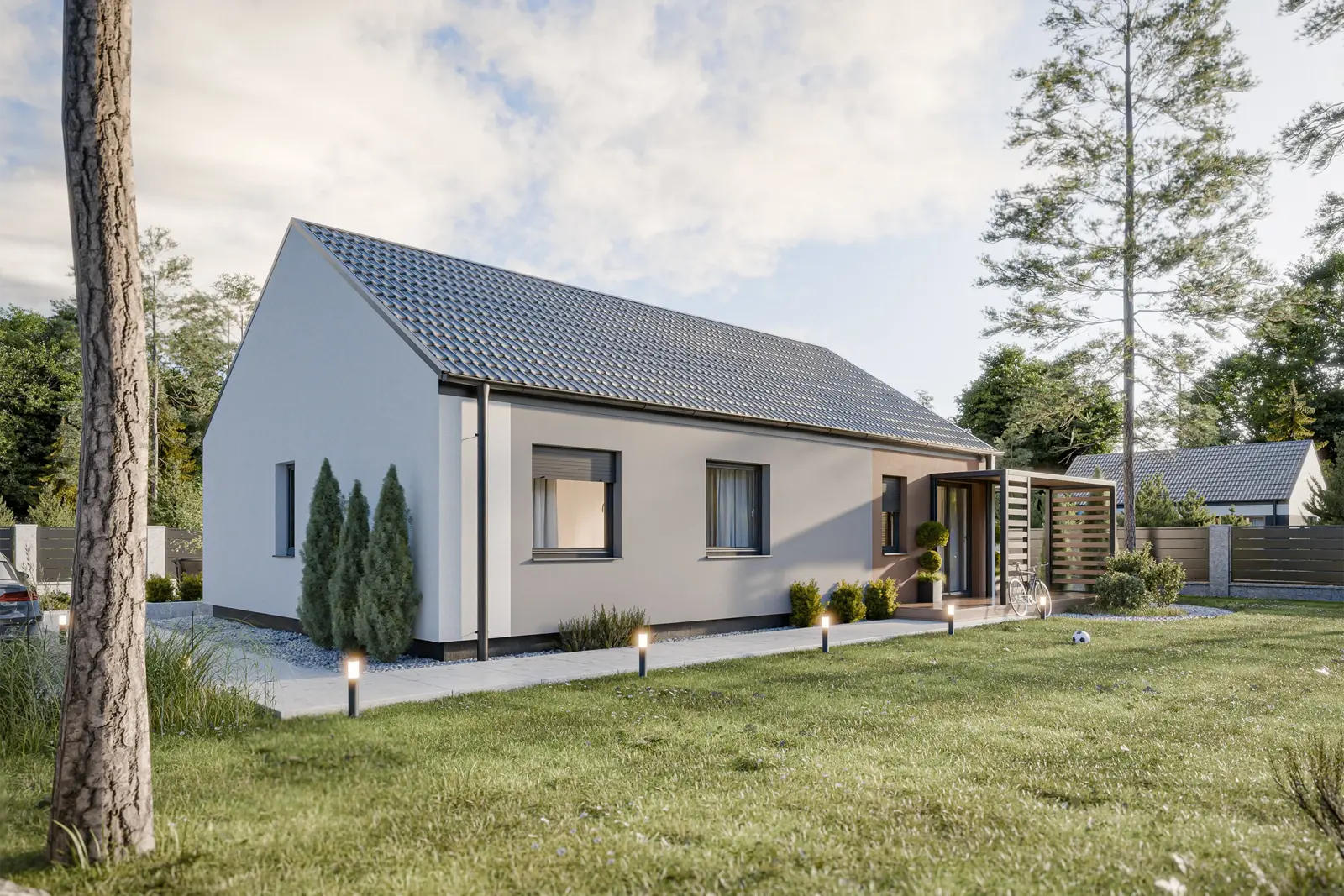 Dům 90 je ideální zlatou střední cestou pro rodiny, které hledají komfort čtyř pokojů na kompaktní a úsporné ploše. Dominantou domu je prosvětlený obývací pokoj s kuchyňským koutem a přímým vstupem na zahradu, který doplňují tři samostatné ložnice poskytující soukromí všem členům domácnosti. Promyšlená dispozice efektivně využívá každý metr čtvereční, eliminuje zbytečné chodby a nabízí praktické zázemí v podobě dvou koupelen a zádveří s prostorem pro šatní skříň. Je to moderní alternativa k bytu, která na jednom podlaží přináší luxus vlastního pozemku i veškeré výhody samostatného rodinného domu.